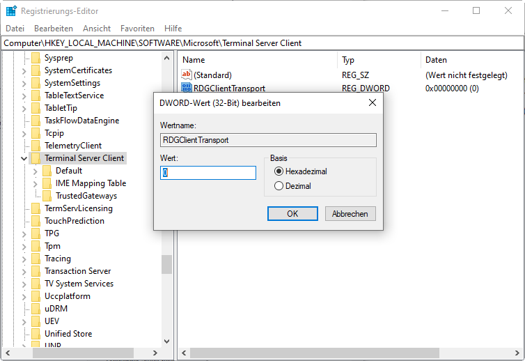 Schritt 4: Benennen Sie den neu erstellten DWORD-Wert in „RDGClientTransport“ um. Doppelklicken Sie anschließend darauf, um die Eigenschaften zu öffnen.