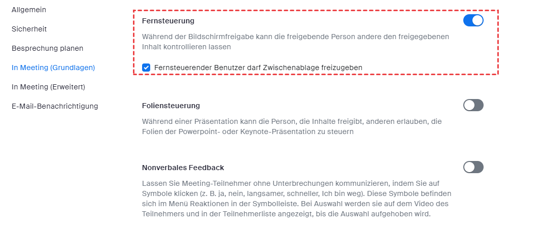 Schritt 3. Öffnen Sie dann die Registerkarte Meeting. Aktivieren Sie Fernsteuerung. Sie können auch das Kontrollkästchen „Fernsteuernder Benutzer darf Zwischenablage freizugeben“ aktivieren, damit kopierte Informationen während der Fernsteuerung über Zoom freigegeben werden können.