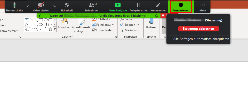 „Zoom Fernsteuerung beantragen“ ist eine Funktion, mit der Sie die Kontrolle über den Bildschirm eines anderen Meeting-Teilnehmers übernehmen können, wenn dieser es Ihnen erlaubt. Sie können die Fernsteuerung des Bildschirms eines anderen Teilnehmers entweder beantragen oder erhalten diese. Sobald Sie die Erlaubnis erhalten haben, können Sie die Maus und die Tastatur des Teilnehmers steuern und Text von dessen Bildschirm auf Ihren Bildschirm kopieren.