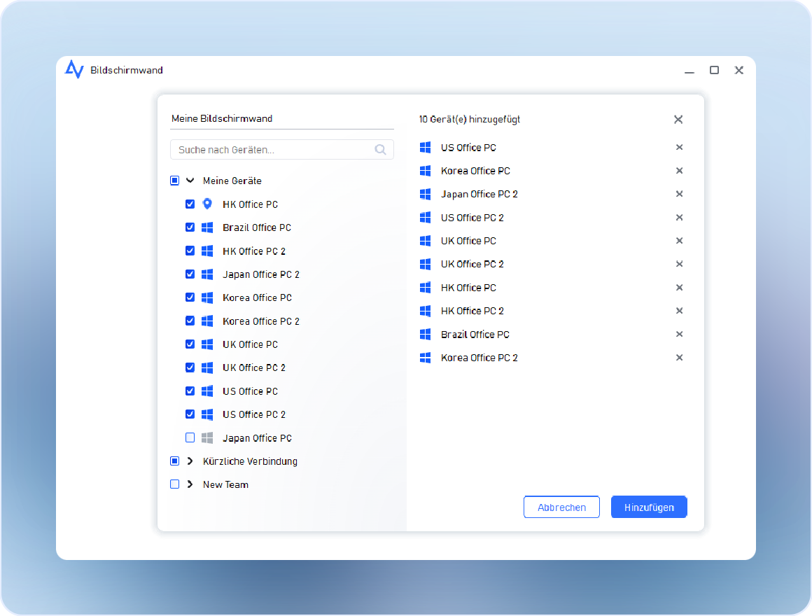 Wählen Sie die Geräte aus, die in die Bildschirmwand aufgenommen werden sollen, und klicken Sie dann auf Hinzufügen. Jede Bildschirmwand kann bis zu 24 Ferngeräte gleichzeitig anzeigen und ermöglicht es Ihnen, alle nahtlos von einem einzigen Dashboard aus zu überwachen und zu verwalten.