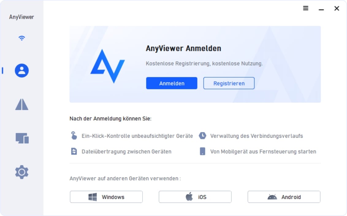 Downloaden, installieren und starten Sie AnyViewer vorher auf dem Remote-Windows-Computer. Registrieren Sie sich für ein AnyViewer-Konto und melden Sie sich an. Stellen Sie sicher, dass AnyViewer aktiv und ausgeführt bleibt.