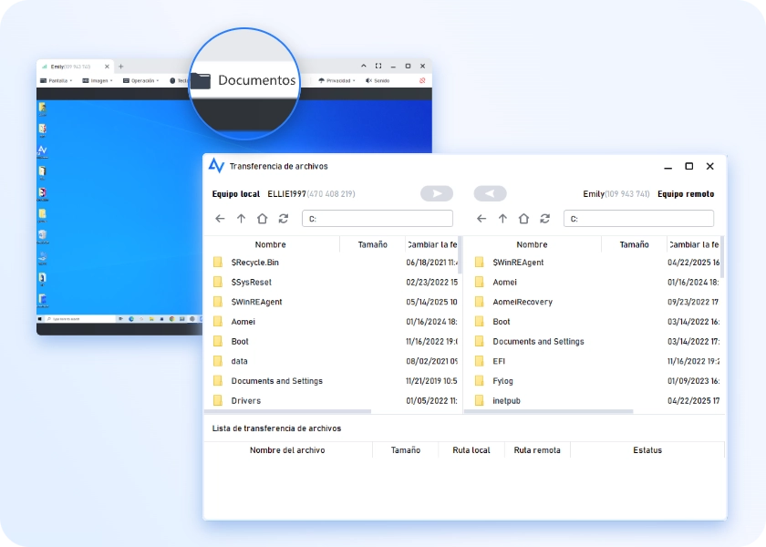 AnyViewer facilita la transferencia remota de archivos grandes como videos y datos, eliminando la necesidad de usar correos electrónicos u otro software con límites de tamaño y soluciones complejas.