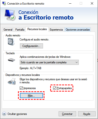 Paso 2. Haz clic en Mostrar opciones y ve a Recursos locales. Marca la opción Portapapeles y luego haz clic en el botón Más.