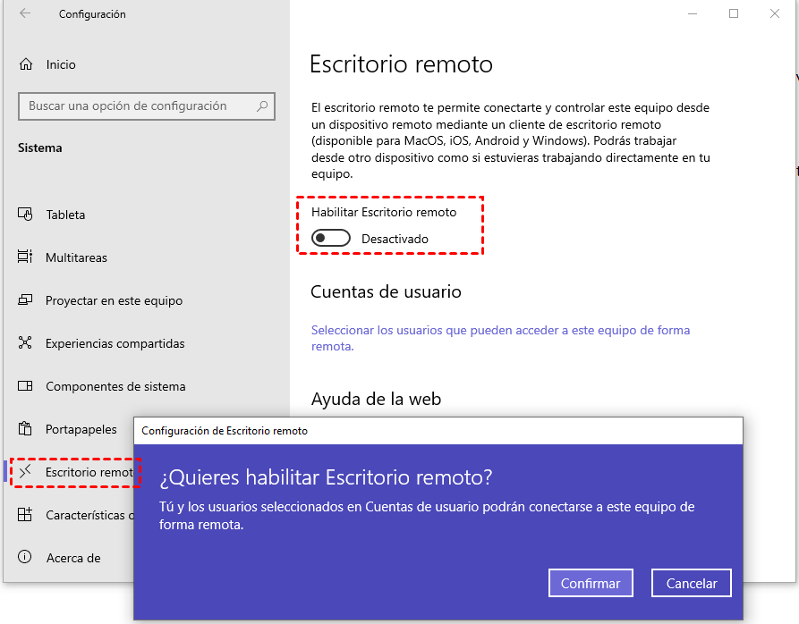 Vaya a: Configuración > Sistema > Escritorio remoto > Activar el interruptor Habilitar Escritorio Remoto y luego hacer clic en el botón Confirmar.
