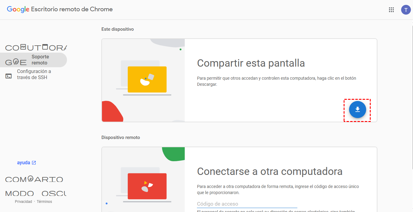 Paso 1. Abre la página de descarga de Chrome Remote Desktop. Haz clic en Asistencia remota en el panel izquierdo y luego haz clic en el botón azul de descarga.