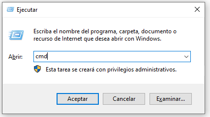 Paso 1. En Windows 10, abre la ventana Ejecutar, escribe "cmd" y presiona Enter para abrir el Símbolo del sistema.