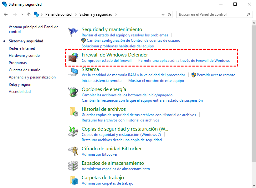 Paso 2. Navega hasta aquí: Panel de Control > Sistema y seguridad > Firewall de Windows Defender.