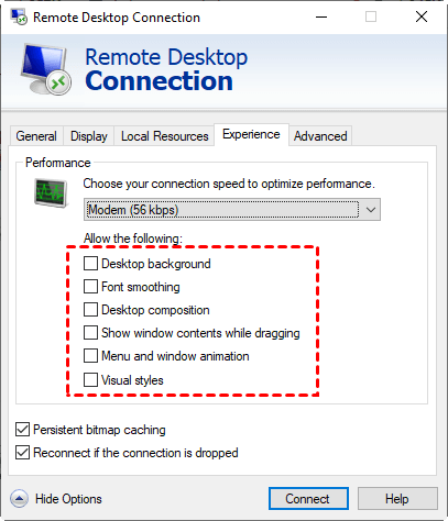 Parfois, les paramètres de la connexion Bureau à distance peuvent provoquer l"erreur de code 0x1104. Suivez les étapes ci-dessous pour décocher toutes les options.