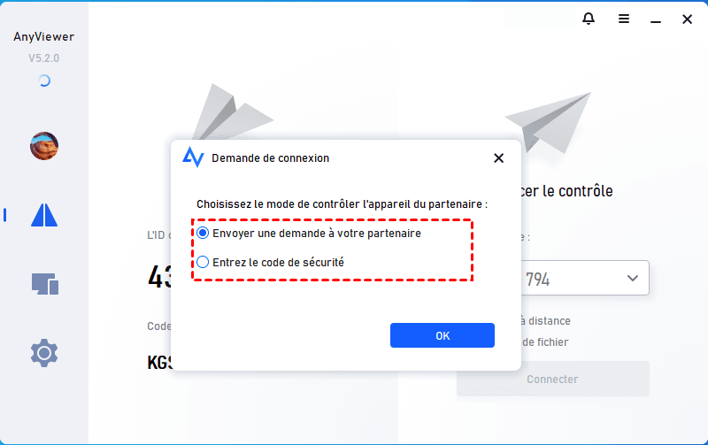 Étape 3. Lancez AnyViewer sur l’ordinateur client, accédez à la section Connexion, saisissez l’ID du partenaire, cochez le mode Contrôle à distance, puis cliquez sur Connecter.