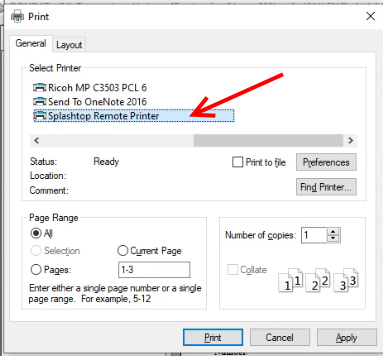 Étape 5. Lorsque vous vous connectez à l'ordinateur à distance depuis un autre appareil, ouvrez n'importe quelle application et imprimez comme vous le feriez normalement. Dans la boîte de dialogue d'impression, choisissez « Splashtop Remote Printer ».