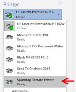 Parfois, la fonctionnalité est correctement installée, mais l'impression échoue car la mauvaise imprimante est sélectionnée. Lors d'une session à distance, vous devez d'abord choisir « Splashtop Remote Printer ». Cela redirige le travail d'impression vers votre ordinateur local, où vous pouvez ensuite choisir votre imprimante physique.
