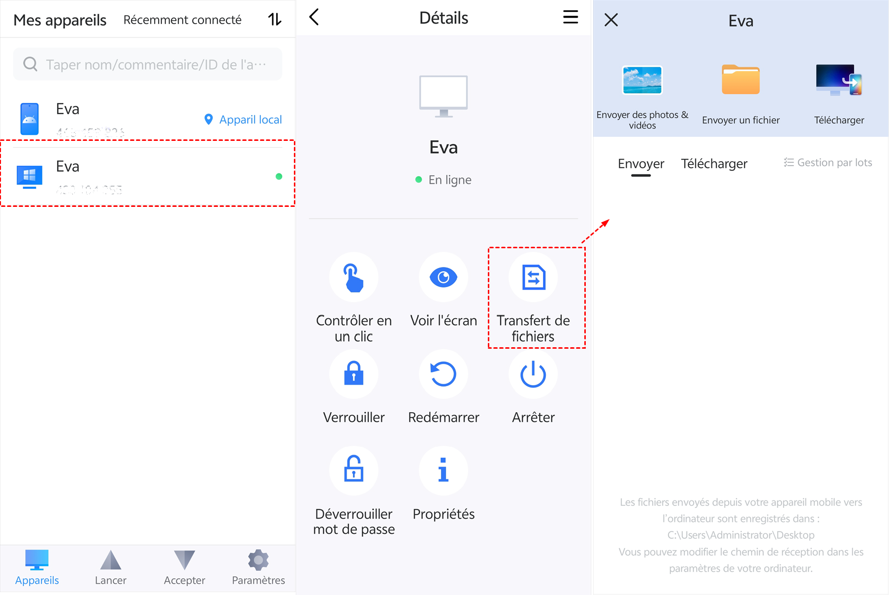 Étape 4 (optionnel). Contrôlez le PC à distance si nécessaire : Vous pouvez également contrôler votre PC depuis un appareil mobile facilement, cliquez sur « Contrôler en un clic » pour lancer une session à distance.