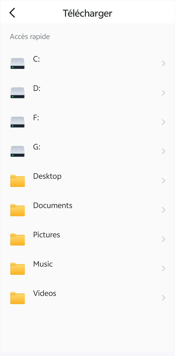 Les disques et bibliothèques du PC distant s’affichent alors sur votre téléphone. Il vous suffit de parcourir le chemin cible, sélectionner les fichiers souhaités et les télécharger sur votre appareil.