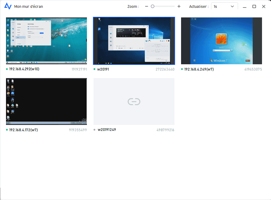 La fonction Mur d’écran (Screen Wall) d’AnyViewer simplifie la supervision des activités sur de nombreux ordinateurs simultanément. En créant des murs d’écrans personnalisés et en y intégrant les appareils de votre choix, les utilisateurs peuvent observer et gérer les écrans en un seul clic, améliorant ainsi l’efficacité du processus de gestion. Que vous soyez technicien informatique ou chef d’équipe, AnyViewer vous permet de surveiller et de traiter les activités ou problèmes sur plusieurs ordinateurs en même temps.