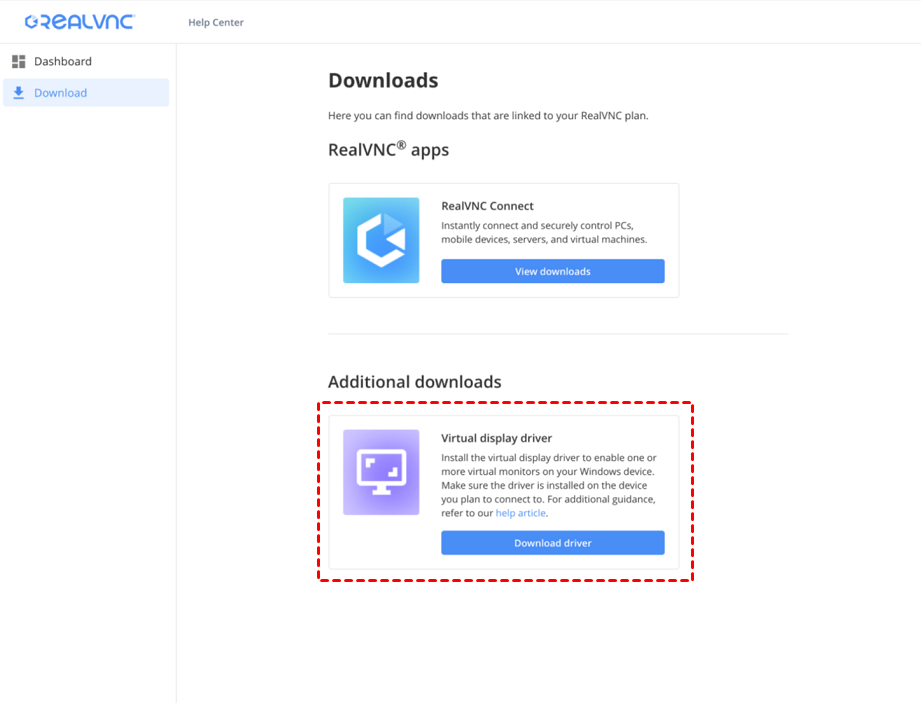 Step 1. Log in to the RealVNC Connect Portal and navigate to the Downloads section to find the Virtual Display Driver.