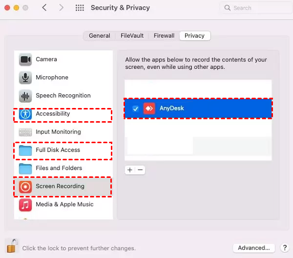 To use AnyDesk session recording features on macOS, make sure the app has proper permissions: