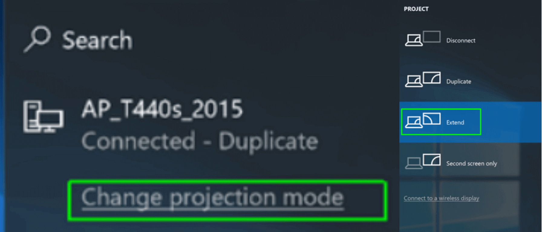 Step 5. Opt for "Change projection mode" and designate "Extend" from the ensuing menu if you prefer utilizing the wireless display as a secondary desktop, rather than a direct replica of your existing desktop.