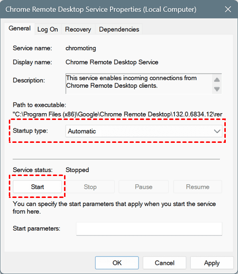 Step 3. Press "Win + R", type "services.msc", and ensure "Chrome Remote Desktop Service" is set to Automatic and is currently running.