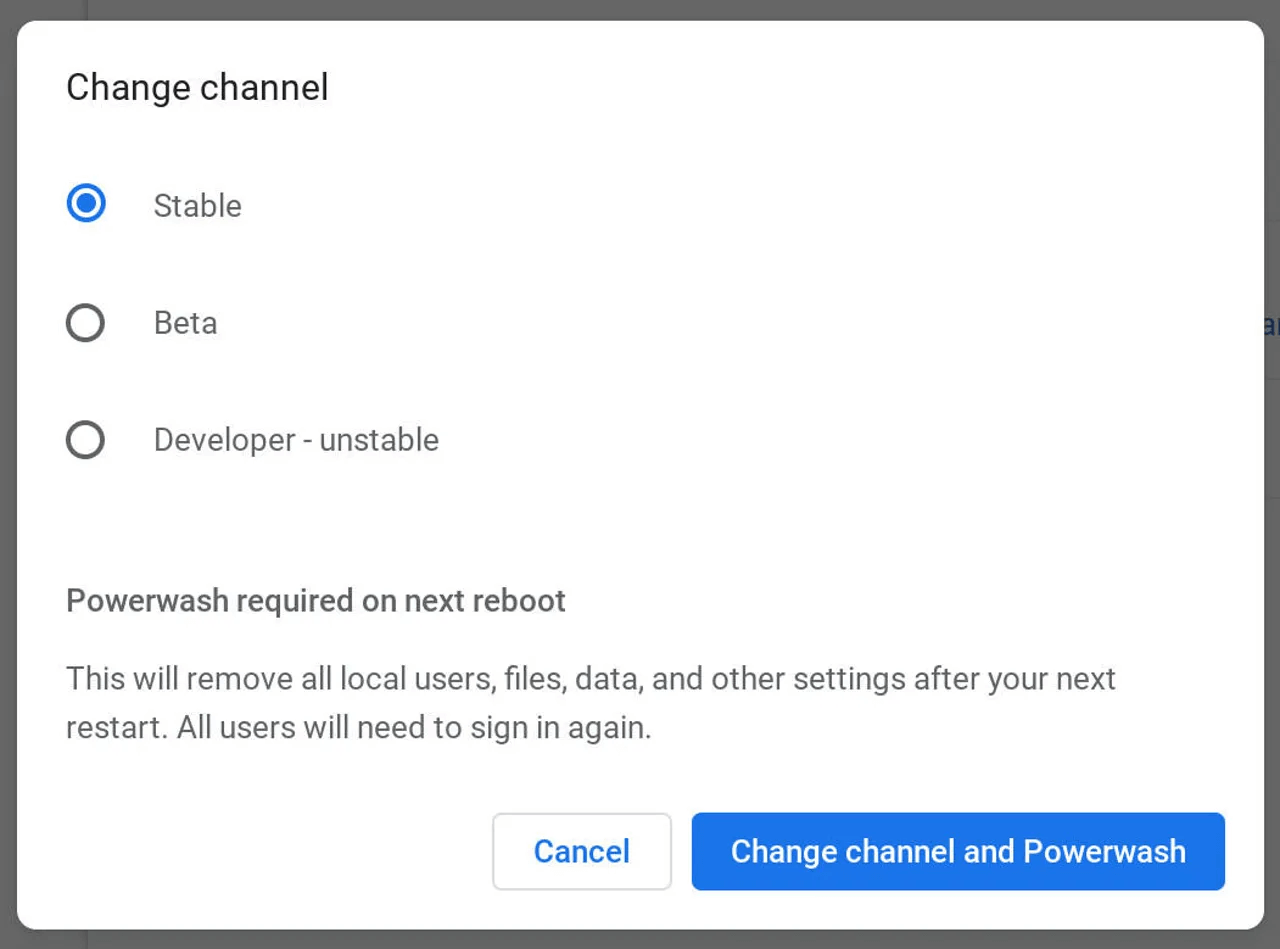 Note: Switching to the Stable channel will "Powerwash" your device, deleting local files. Be sure to back up your data to Google Drive first.