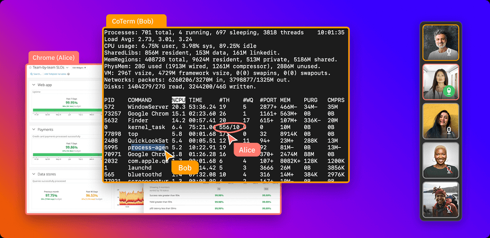 CoScreen, now part of Datadog, was made with engineering teams in mind. It’s built for rapid, hands-on teamwork. Just install the desktop app, start a session, and invite collaborators via a secure link or email. Participants can all share screens simultaneously and even interact with shared apps in real time.