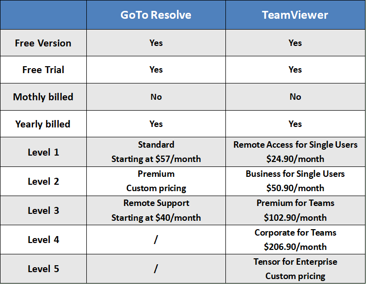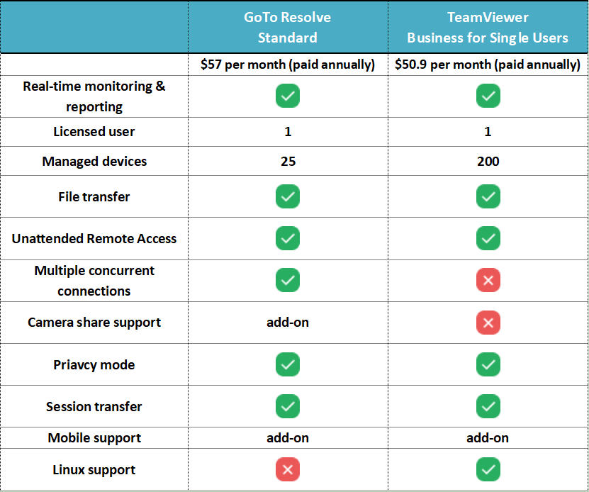 Here’s a feature comparison of GoTo Resolve Standard and TeamViewer Business for Single Users, billed at similar prices.