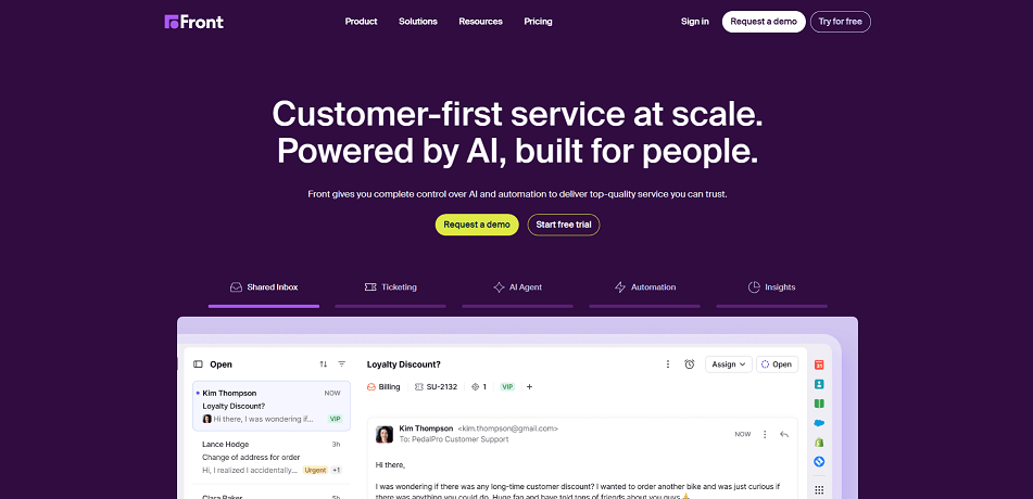 Front centralizes emails, chats, social media messages, and SMS into a shared inbox, allowing teams to assign conversations to specific members for clear accountability. Internal comments within threads make it easy to exchange insights, share context, or request input without cluttering external communication.