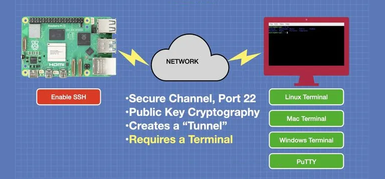 When you connect via SSH, a secure channel, or “tunnel”, is created between your computer and the Raspberry Pi. This channel encrypts all communication using public-key cryptography, ensuring that only authorized users can gain access. SSH connections are fast, lightweight, and ideal for headless (no monitor) setups.
