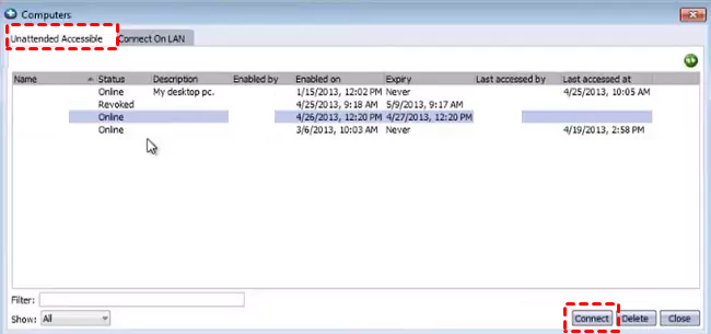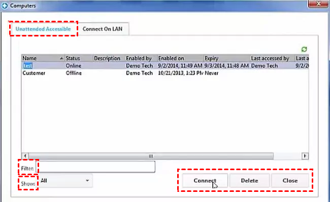 Step 3. Go to the Unattended Accessible tab and use the Filter box to locate a computer by name. Use the Show box to filter by status.