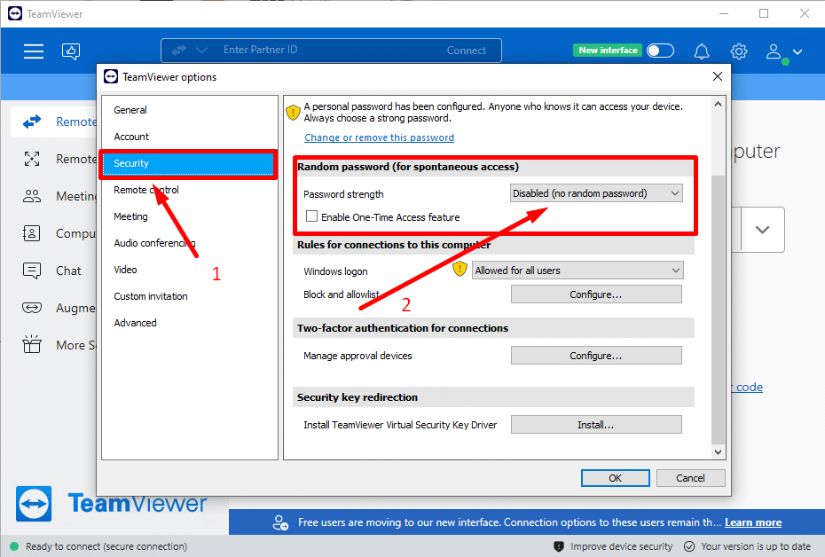 Step 2. In the Options window, open the Security section and disable the random password for spontaneous access.
