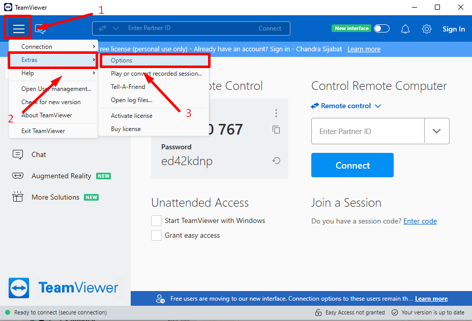 Step 1. Open TeamViewer on your computer, click the menu icon in the top-right corner, and go to Extras, then Options.