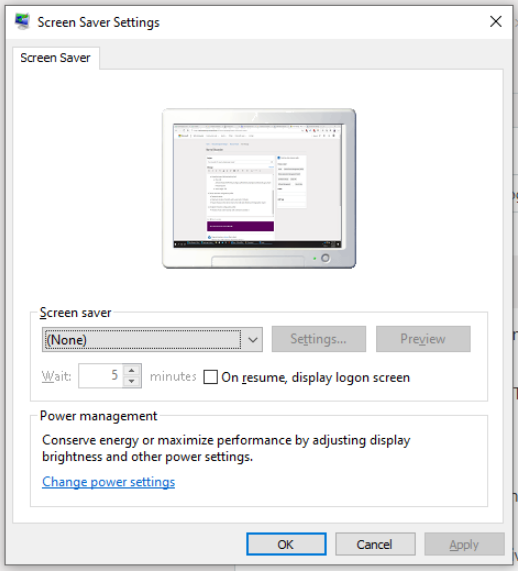 Step 2. Set the screensaver to None and uncheck “On resume, display logon screen”.