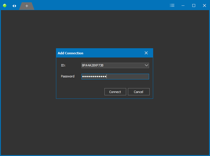 To connect, the client presses "Connect" and enters the host’s ID and password. Multiple connections can be managed through the program’s tabs.