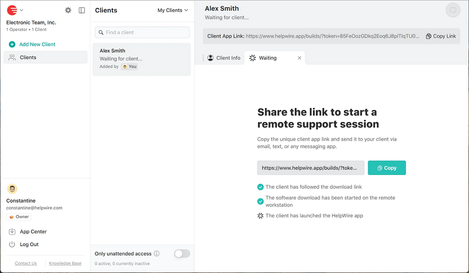 The client generates a link in their HelpWire account, sends it to the host, and requests access. Once granted, the client connects to the host’s screen.
