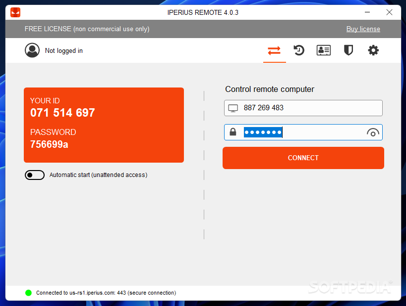 Enter the host's ID in the second text box and click "Connect". Enter the password when prompted. Iperius Remote is a fast, free solution for on-demand access. Both users can start connecting in just a few minutes.