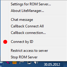 The host needs to install LiteManager Pro – Server.msi (free) from the ZIP file. Connections can be made via IP, computer name, or ID. The easiest way is to right-click the server in the taskbar, select "Connect by ID," clear the existing ID, and click "Connected" to generate a new one.
