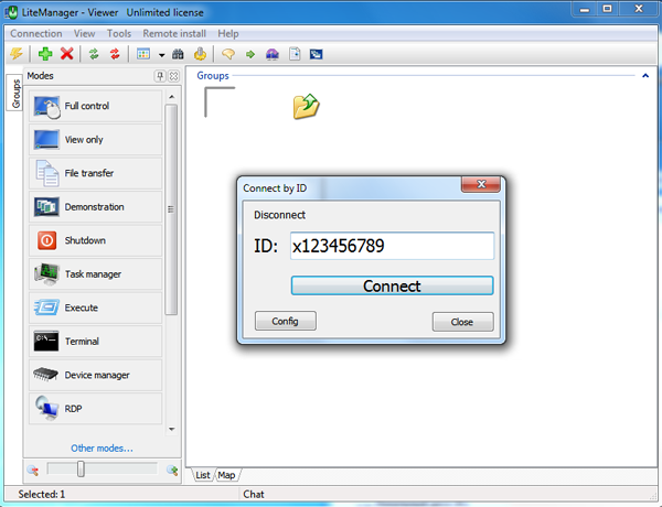 The client installs the Viewer program, choose Connect by ID command in the main window of the program. In the opened window, enter the ID of the required server and press the Connect button.