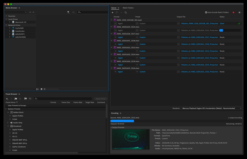 - Adobe Media Encoder will automatically start creating proxy files based on your preset.