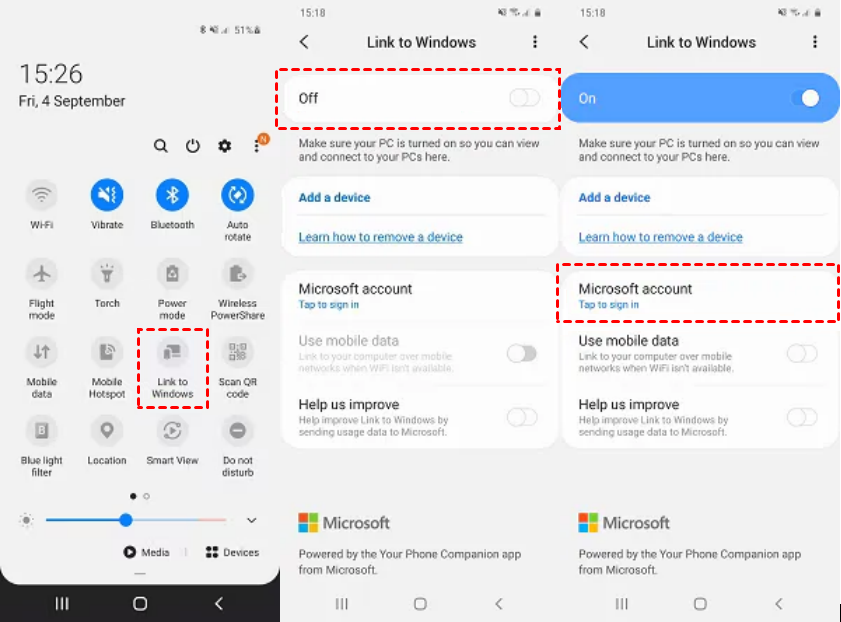 Step 5. Swipe down from the top of your phone screen to access the quick panel, and tap Link to Windows. If not found, open the Your Phone app.