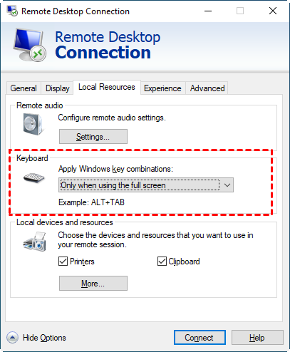 To ensure Windows keyboard shortcuts work properly during a Remote Desktop session, follow these steps to set up Remote Desktop Connection: