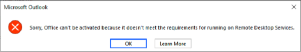 Sorry, office can’t be activated because it doesn’t meet the requirements for running on Remote Desktop Services Hello, We have a user that has started to receive the error "Sorry, office can’t be activated because it doesn’t meet the requirements for running on Remote Desktop Services" when they try to launch Word, Outlook or Excel when logged into our server using RDP. They have an E3 license and this issue started 2 weeks ago, where it was working fine for them for 2+ years before that.