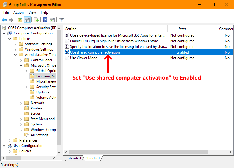 Step 5. Enable the policy called Use shared computer activation and save the changes.