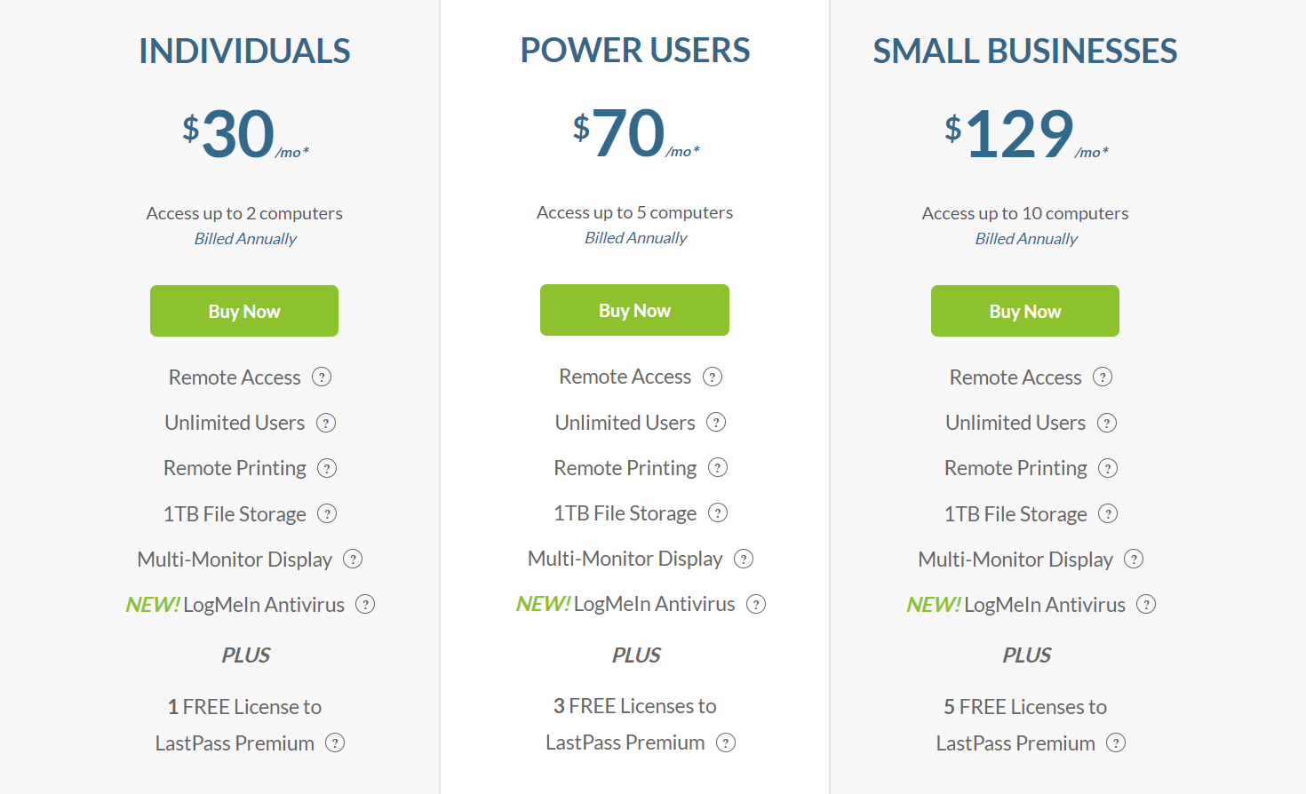 LogMeIn does not have a free plan. It offers three different pricing plans (14-day free trial) for individuals, power users, and small businesses. All require billed annually.