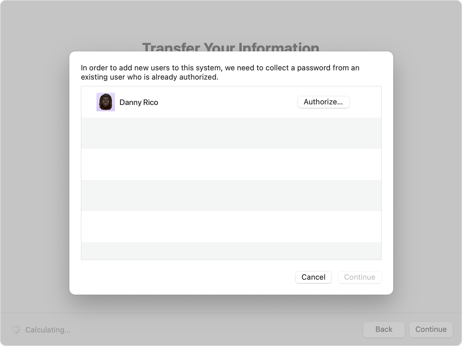 - Migration Assistant will calculate the storage used by your files, apps, and settings.