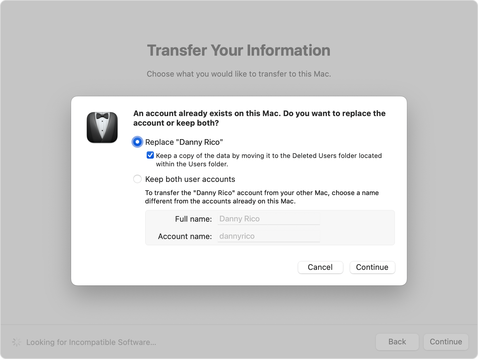 - When prompted, select "Transfer from a Mac, Time Machine backup, or startup disk" and click Continue.