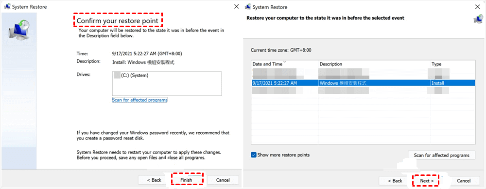 Step 4. Click “Next”. Then confirm your selected restore point again and click “Finish”.