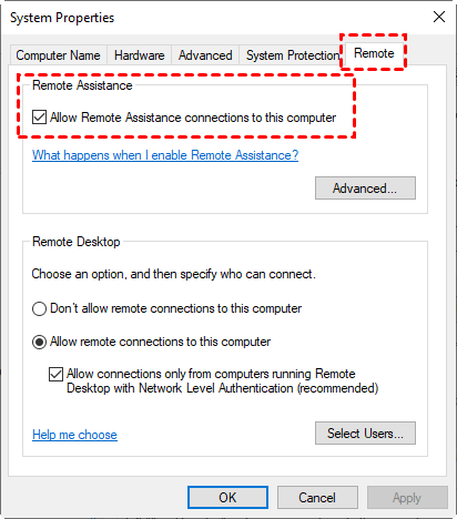 Step 2. Switch to Remote tab and then click Allow Remote Assistance connections to this computer.
