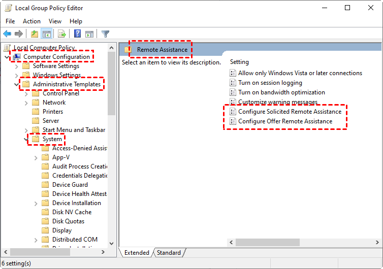 Step 2. Navigate here: Computer Configuration > Administrative Templates > System > Remote Assistance. On the right pane, find Configure Solicited Remote Assistance and Configure Offer Remote Assistance, and then double-click it.