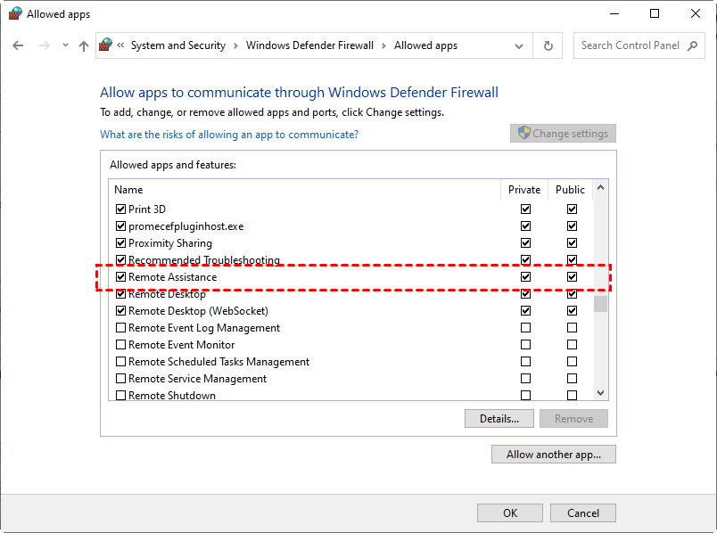 Step 2. Please make sure Remote Assistance is allowed through Windows Defender Firewall on both Private and Public networks.
