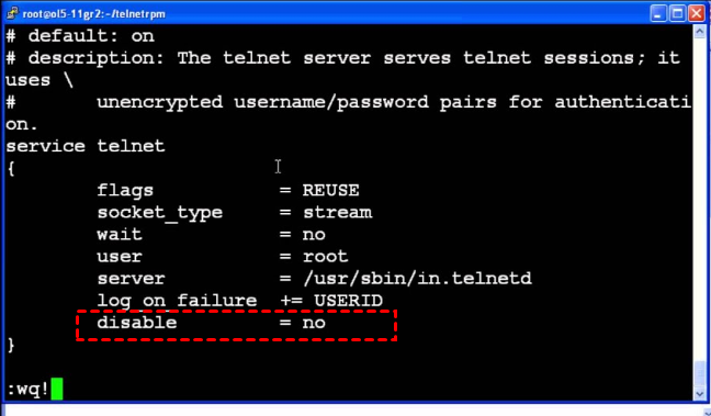 File konfigurasi Telnet terletak di /etc/xinetd.d/telnet. Dengan mengubah parameter disable=no, layanan Telnet tersedia di perangkat tujuan.