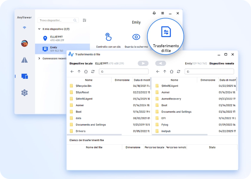 AnyViewer semplifica il trasferimento remoto di file pesanti, come video e dati, eliminando la necessità di email o altri software con limiti di dimensione e soluzioni complicate.